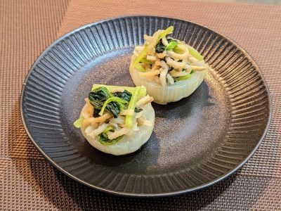 フライパンにごま油をひいて、玉ねぎのみじん切り・切り干し大根・小松菜・ごぼうを炒め、ごぼうがしんなりしたら、水(300ml)・鶏ガラ粉末(大さじ1.5)・はちみつ(大さじ2)・みりん(大さじ1)・白みそ(大さじ2)を入れて中火で煮詰めます。煮汁が1/3程度になったら火から下ろし、玉ねぎの器に盛りつけたら出来上がりです。