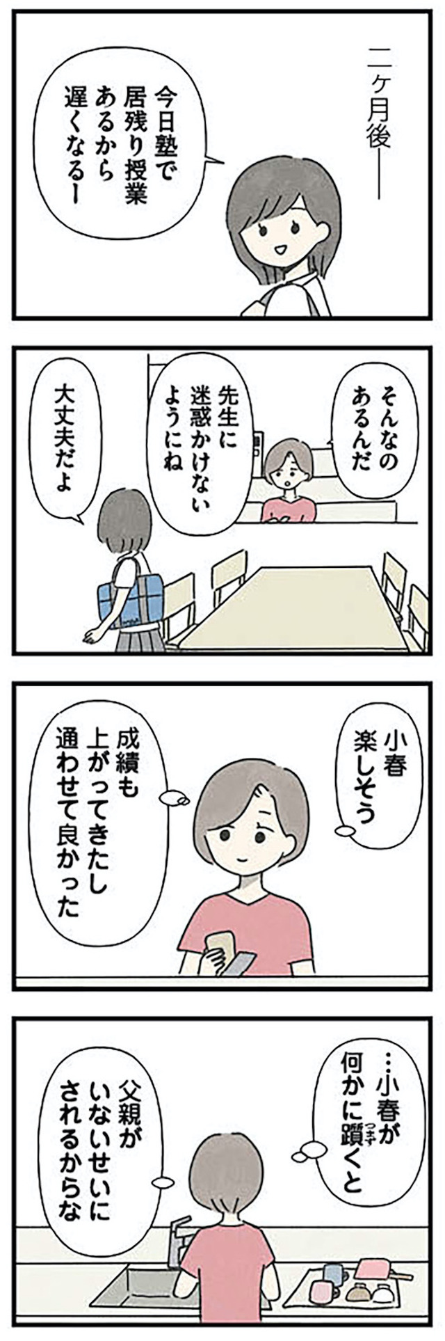 熱心に小春に勉強を教えてくれる森先生。おかげで小春の成績も上がっていき、安心していたが、小春が「ママに会わせたい人がいる」と言い、交際相手として連れてきたのはなんと塾長の森先生だった…。