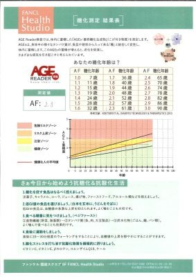 さて、測定に戻って、今回私にとって目玉の測定。なんと、実年齢54歳に比して、7歳上の61歳相当でした! かなりの老けっぷり!!
