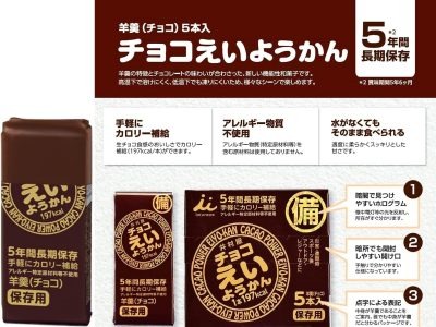 ●「防災用ようかん」:長期保存が可能なうえ、手軽にカロリー補給ができるため