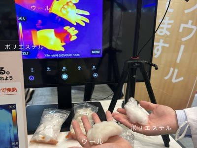 サーモグラフィーによると、湿気を含むことで、ポリエステルよりもウールのほうが高温(白色)になったことがわかる