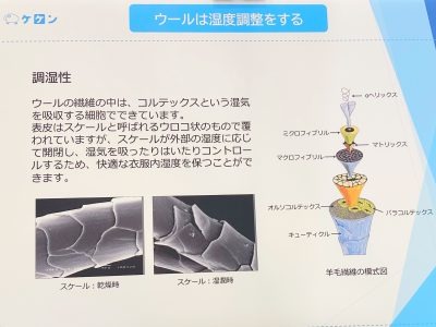 ウールは湿度が低い、つまり乾燥しているとうろこ状の部分が開き、湿度が高いとスケールが閉じるという特徴があります。
