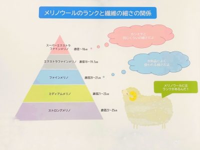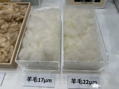 人がちくちくと感じるのは30μm(マイクロメートル)以上の繊維で、多くの人は25μm以下だとちくちく感じないと言われています。展示会場には17μmと22μmのウールのわたを触ることができたのですが、17μmは繊維っぽさを感じないくらい柔らかくてふわふわでした。