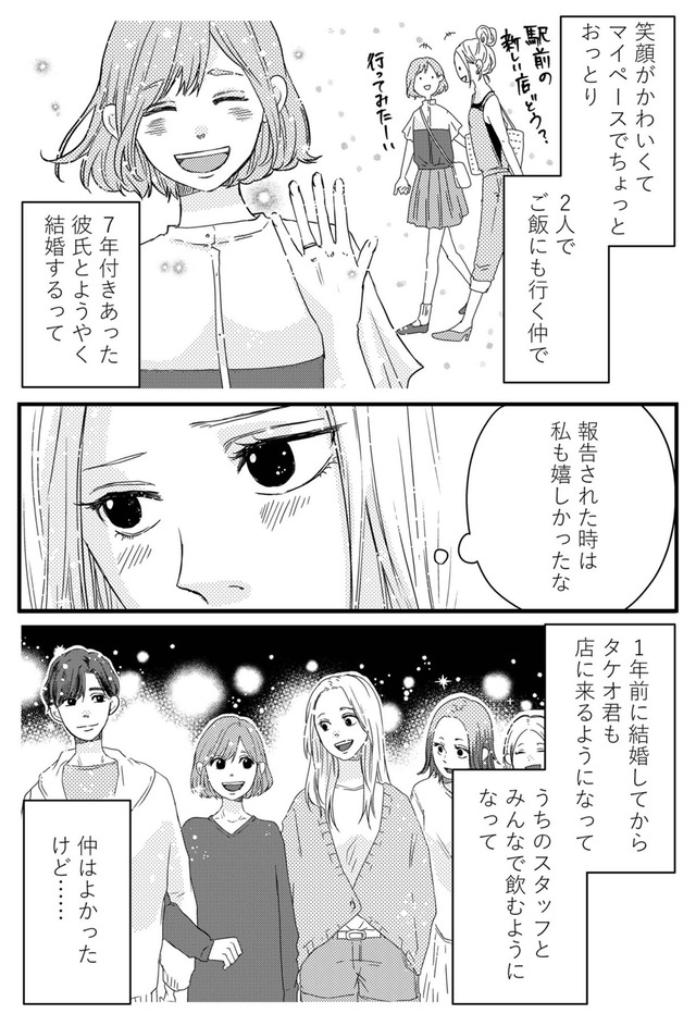 美容師のミカンは、2年付き合っていた彼氏と別れる前から、常連客の夫・タケオに恋愛相談をしていた。