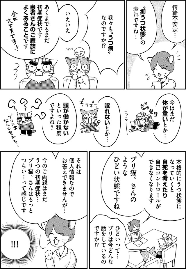 ブリ猫。父は定年間近でもバリバリ働き、娘・ブリ猫。は二人目の子供を出産したばかり。公私ともに順風満帆!……のはずだった。ある日、ブリ猫。が意識混濁で緊急搬送されたことで、初めて娘が“精神科”にかかっていること、薬を大量に飲んでOD(オーバードーズ)したことを知り……!?「何が原因?」「うつ?」「心の病気?」わからないことだらけだけど、患者とその家族が”双極性障害”を受け入れて生きていく……その半生を描いた感動の実録エッセイ!