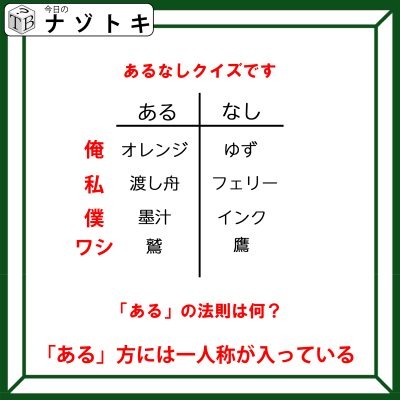 あるなしクイズです!「オレンジにあってゆずにない。鷲にあって鷹にない」この法則性が分かりますか?【難易度LV3.・中辛】