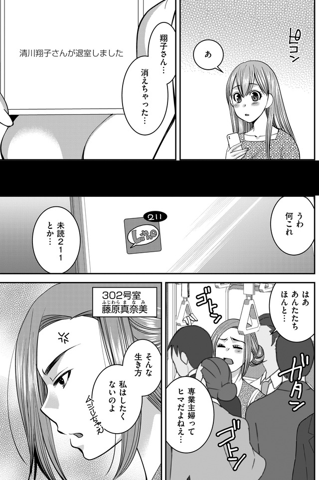 しかし同時に【平社員の妻の会】のトークルームでは、翔子の言動とパンチの効いた顔をディスるメッセージの嵐で……!?