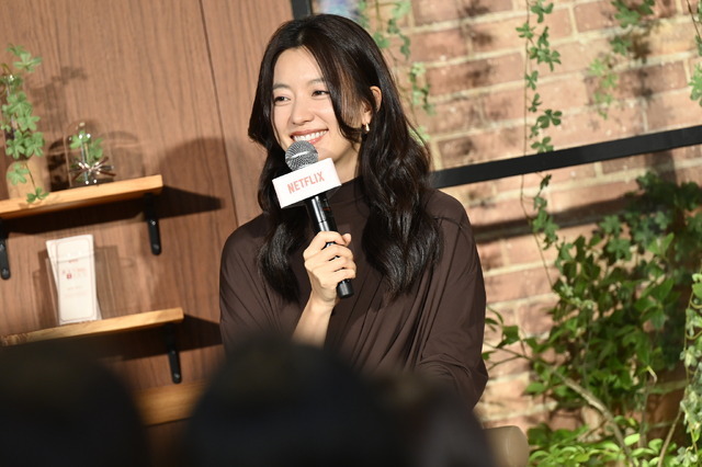 ハン・ヒョジュは「ハナは視線恐怖症をもっているんですけど、私もイベントの時とか、今日も緊張してます。あまりそう見えないみたいなんですが、実は緊張してドキドキしてます。そこがハナに共感できるかなと思いました」と話す。