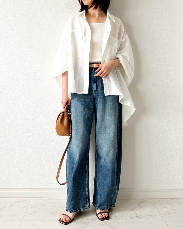 ボタンを留めずに着崩すことで、適度な透け感と落ち感が生まれ、体形を気にせずリラックス感のあるおしゃれを楽しめます。濃い色のワイドデニムと合わせることで、ボトムスのボリュームを抑え、すっきりとした印象に。