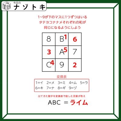 あとは変換表をつかってABCに当てはまる文字を考えていきましょう。正解は「ライム」でした。