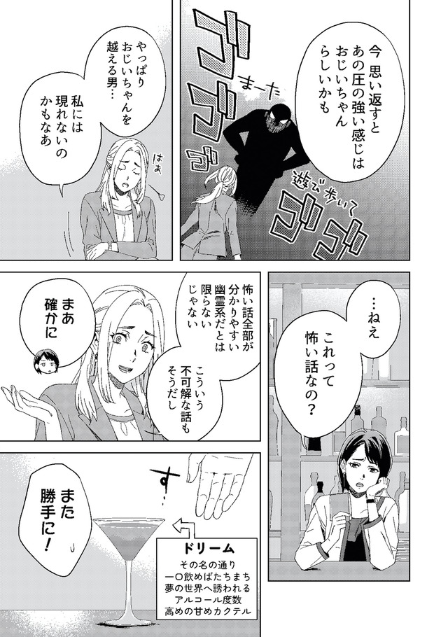 バーを営む霊感ゼロの脚本家・エミ(35歳)。ホラー系連載の締め切りを目前にした彼女は、1杯のタダ酒と引き換えに怪談の“ネタ”を求めていた。