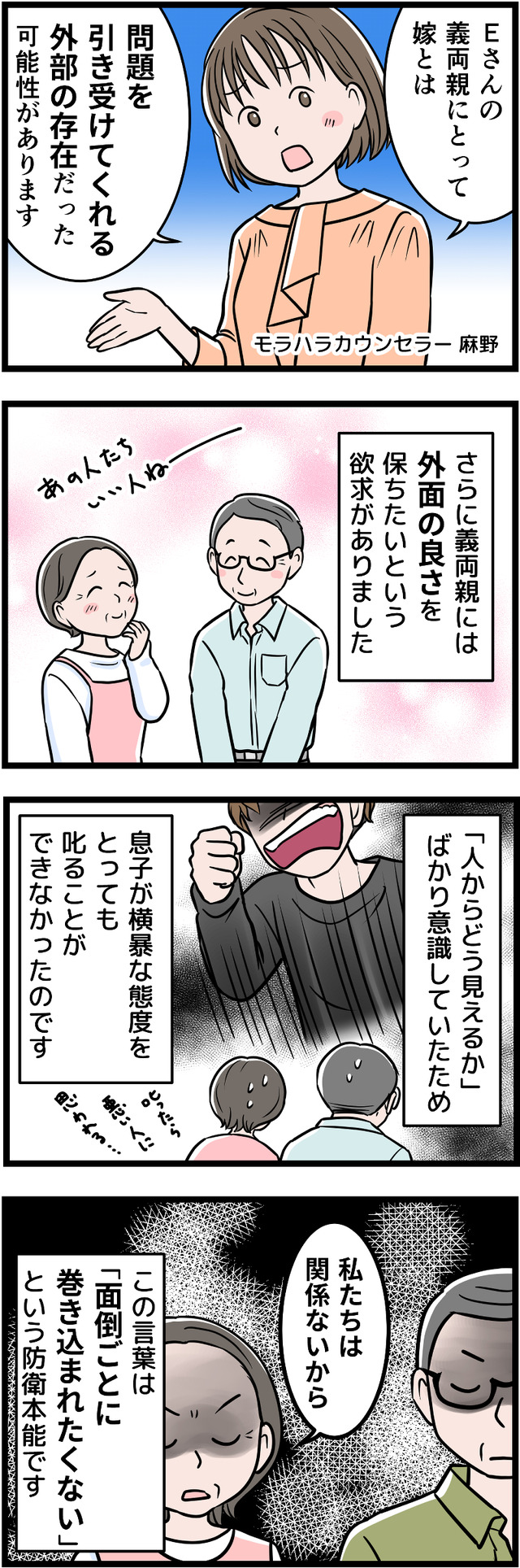 子どもだちの前でも暴言を吐くようになった彼と、もう一緒にはいられない。Eさんは覚悟を決めて、義理の両親に相談に行ったのですが……。そこで受けたのは「私たちには関係ない」という冷たい言葉と、まるで他人事のような冷たい態度でした。