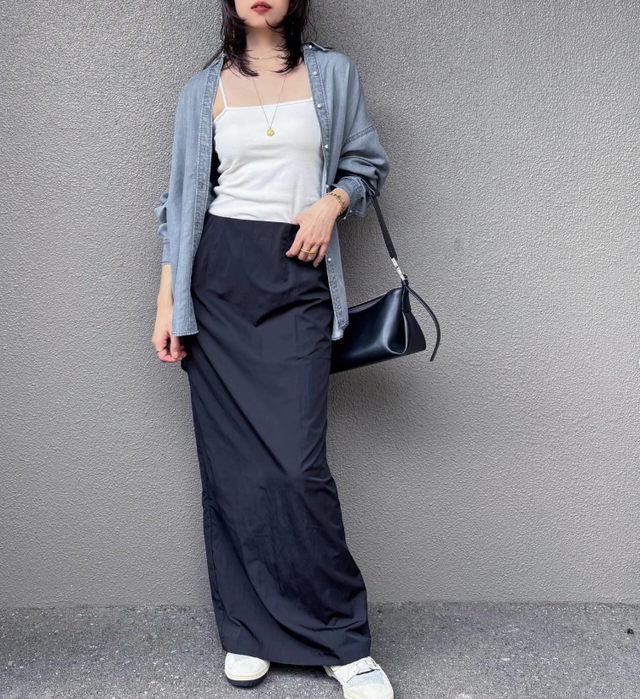 ハードになりがちなグレーデニムシャツを、やわらかく仕立てたライトグレーで軽やかに。パールボタンが上品にきらめくオーバーサイズシャツは、羽織るだけで女性らしさが漂う主役級アイテムです。中には白のキャミソールを合わせて、シンプルながらも抜け感をプラス。ボトムには黒のロングスカートを合わせて、縦ラインを強調。全体をモノトーンでまとめることで、すっきりとした印象に仕上がります。足元は白スニーカーでほどよくカジュアルダウン。アクセサリーやバッグで光を差すだけで、洗練された印象がぐっと高まります。