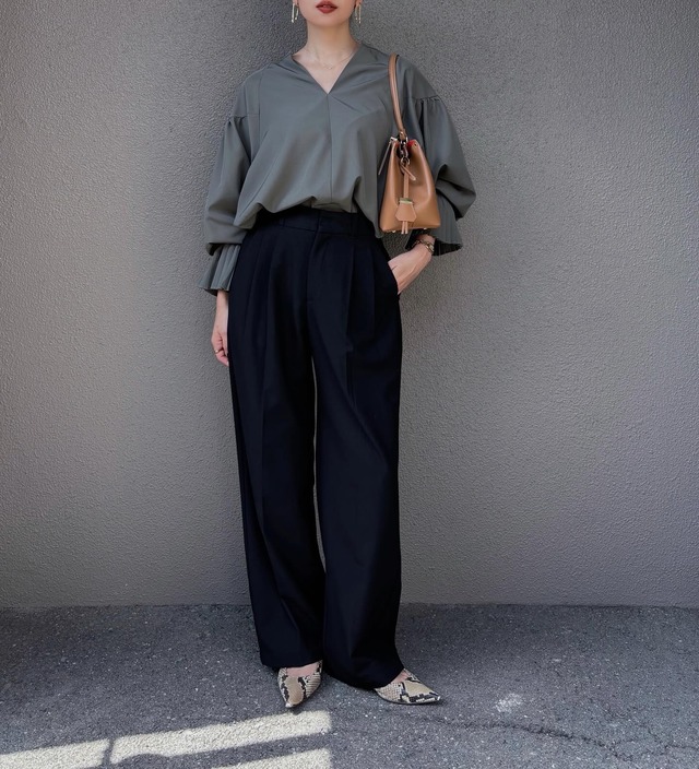 袖口に広がるプリーツが目を引く、やさしく華やかなブラウスです。程よくゆとりのあるシルエットで、体のラインを拾わずすっきり見えるのがうれしいポイント。落ち感のある素材なので、ウエストインしてももたつかず、美しいドレープをキープ。ダークグリーンの深みある色合いが、秋のムードをぐっと引き立ててくれます。合わせたのは黒のワイドパンツ。シンプルながらもシルエットで魅せる組み合わせは、オフィスにも週末のお出かけにもぴったりです。足元はパイソン柄のパンプスでスパイスを添えて。
