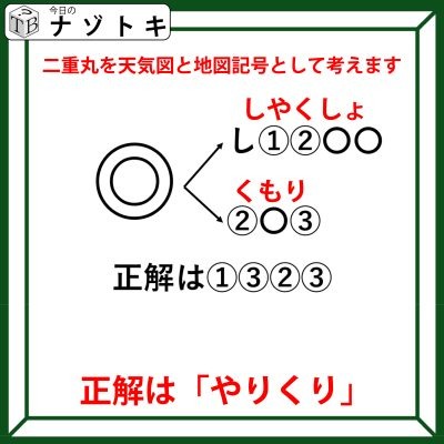 また、下は天気図の記号です。天気図で二重丸は「くもり(曇り)」です。文字数と先ほどの「しやくしょ」と文字の位置が合います。