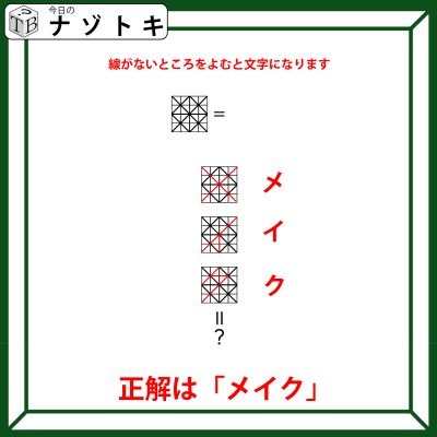するとカタカナを表していることが分かります。それを上から読んでみると答えとなります。正解は「メイク」でした。