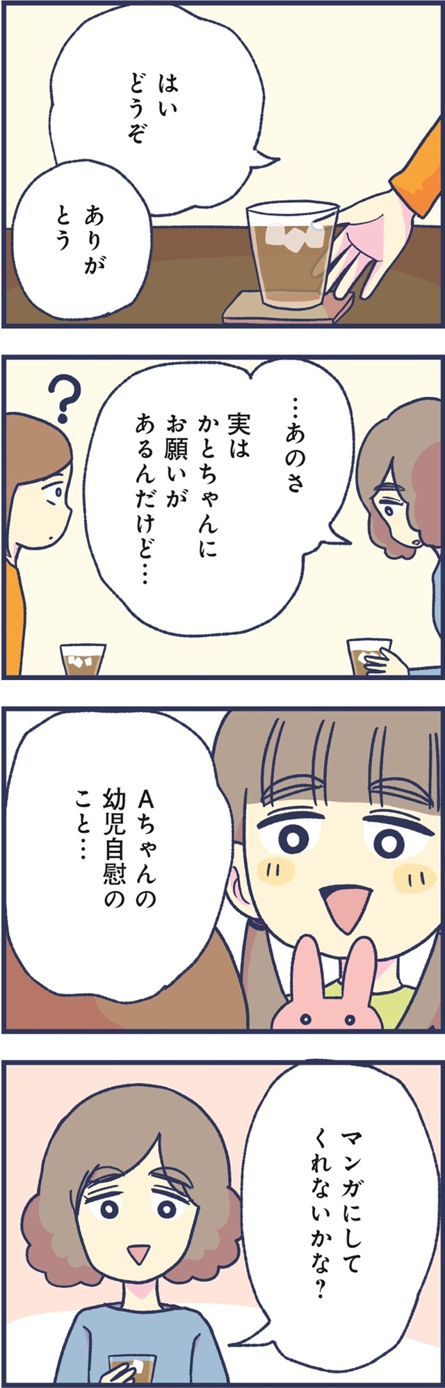 2人目を出産後、甘えてくるようになった4歳の長女。そんなある日、長女が自慰行為にふけっている現場を見てしまい、主人公は大きな衝撃を受けます。ネットで調べても「よくあること」「見守ってあげましょう」という言説ばかりで、母親の葛藤に寄り添うようなものは見当たりません。「娘が気持ち悪い」そう思ってしまう自分に苦しむ日々のなかで、徐々に追い詰められて……。今回は、幼すぎる性の目覚めに葛藤する母娘の苦しみを鮮烈に描いたコミックエッセイを特別抜粋でお届けします。