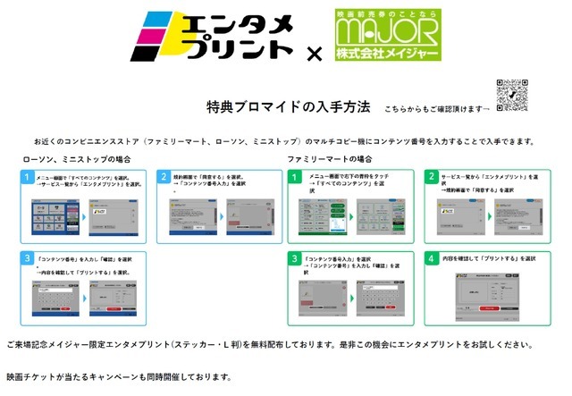 また、来場者限定のうれしい特典も! 会場にて【ご来場記念メイジャー限定エンタメプリントプレゼント(ステッカー・L版)】のコンテンツ番号(印刷用コード)を配布。イードの提供するコンテンツプリントサービス「エンタメプリント」を通じて、全国のコンビニエンスストア(ファミリーマート、ローソン、ミニストップ)のマルチコピー機にてコンテンツ番号を入力することで、ステッカーの印刷が可能となる。