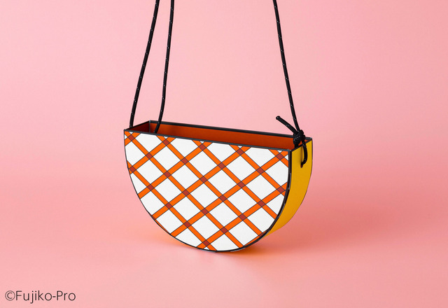 紙製のドラミちゃんのポケットサコッシュ。ドラミちゃんをイメージしたチェック柄とお花があしらわれた道具箱が登場する。