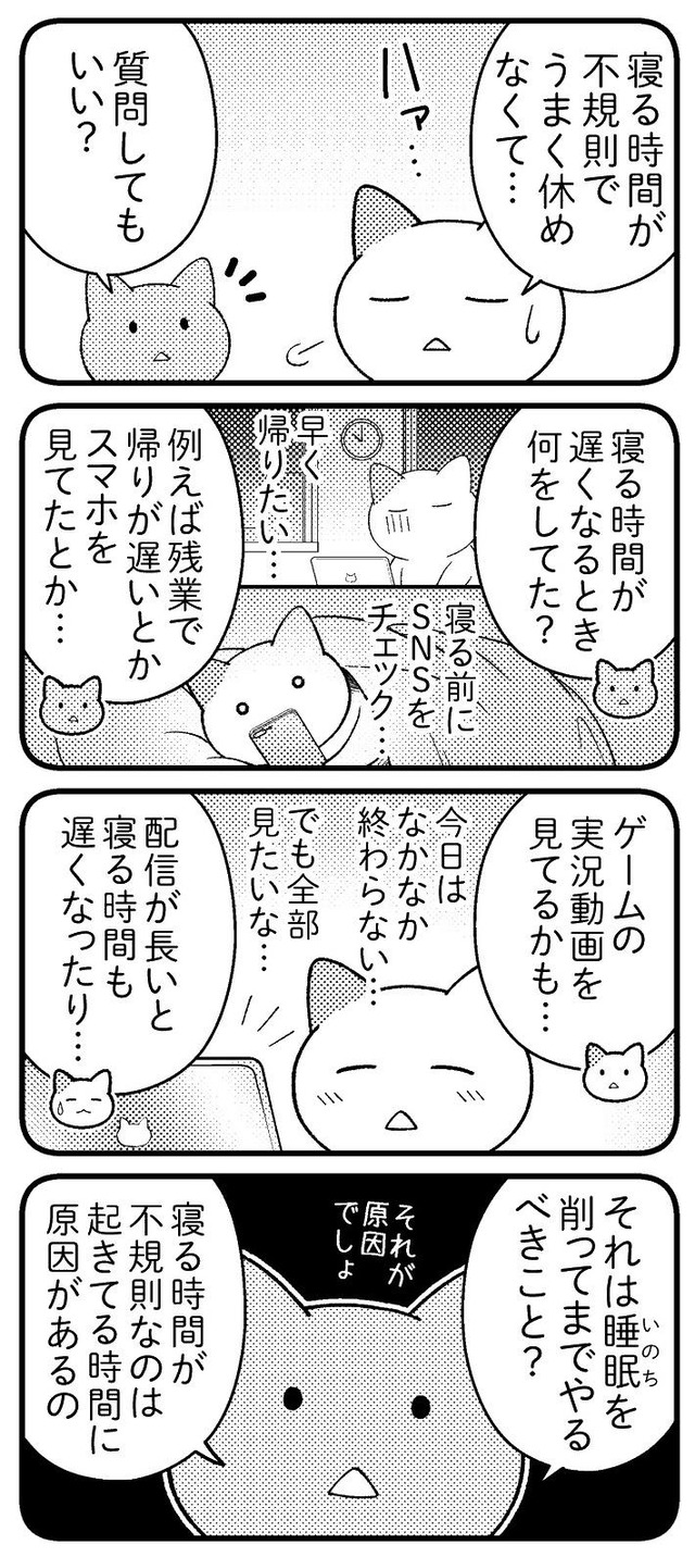 寝る時間がバラバラでうまく休めない…。原因は、起きている時間のある習慣にあった!?【ニャンだかラクになる休み方  #6】