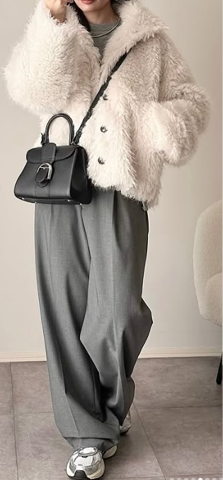 ンフルエンサーの_____ma.k.oさんが着ているのは、ゴージャス過ぎずカジュアル過ぎない絶妙なバランスのデザインが特徴のアウターです。アイボリー系のファーアウターは、同系色のグレーのワイドパンツとスニーカーを合わせ、抜け感のあるカジュアルスタイルに。
