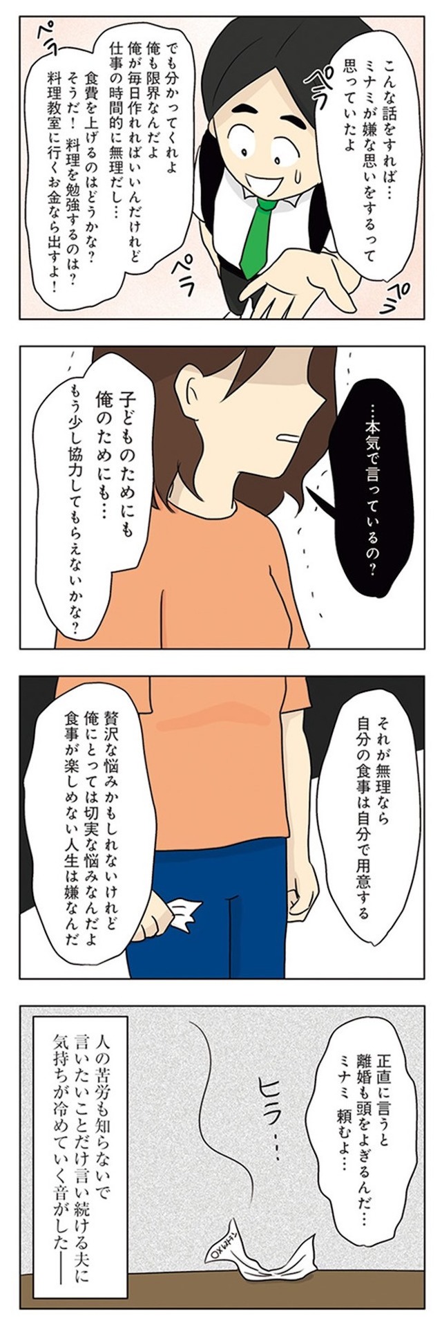ある日、夫から「飯がマズすぎて、離婚が頭をよぎることもある」と打ち明けられる。