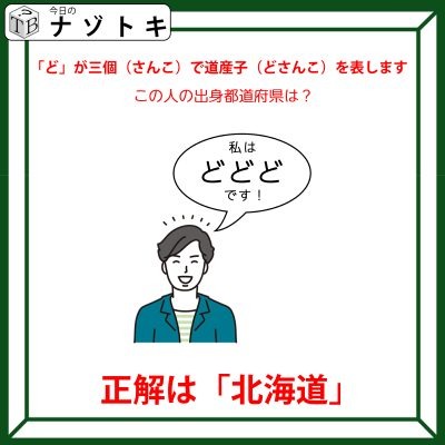 つまり「ど、さんこ(3個)」ということになりますね、「ど、さんこ」続けて「どさんこ(道産子)」です。ここまでくれば分かりますね。道産子とは北海道の出身を表す言葉です!よって正解は「北海道」でした。