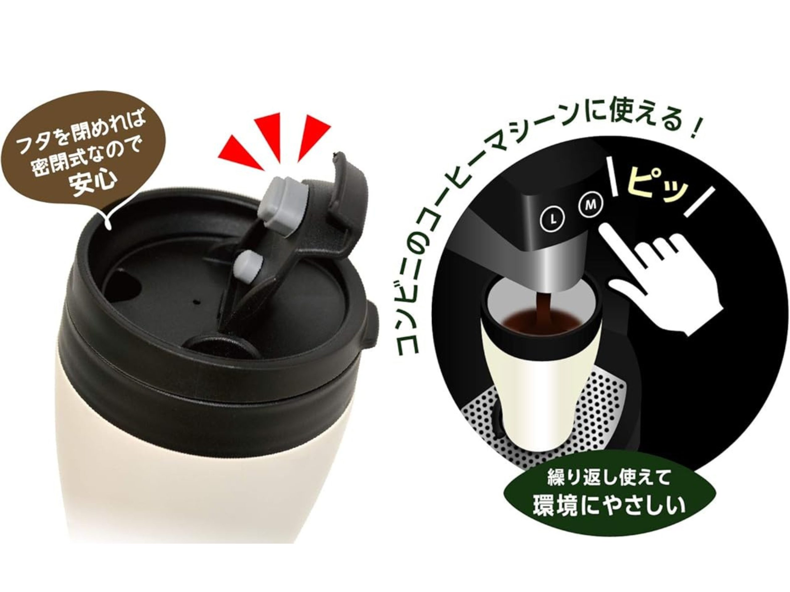 コーヒーマシーンに使えるから、コンビニコーヒーがずっと温かいまま楽しめる♪ 車のドリンクホルダーにも対応。飲み口は完全密閉タイプで、バッグに入れても安心!