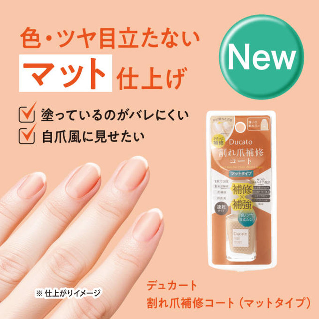デュカートから、「割れ爪補修コート(マットタイプ)」が2026年1月1日(木)に発売。突然の爪のひび割れに対応する補修コートから、色とツヤが目立たないマット仕上げの新タイプが登場。自爪になじむ自然な質感を追求した処方設計となる。