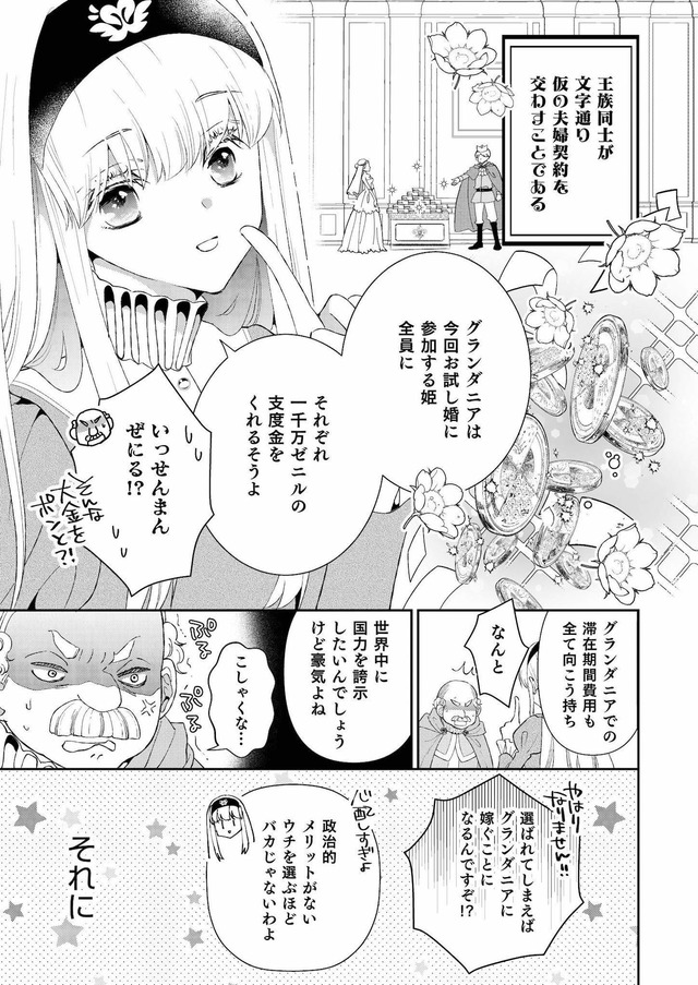 伝統と信仰を重んじるフレイソス王国は超がつくほどの貧乏国。第一王女リリア・フレイソスはこの財政難を脱出するため、超大国グランダニア王国が開催するお見合い結婚パーティ…通称『お試し婚』に参加することに。