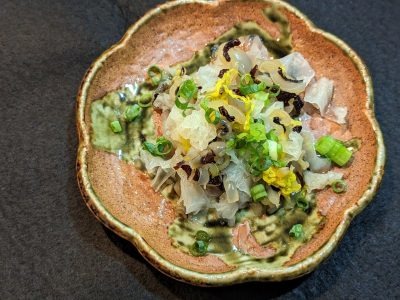 意外な食材「生クラゲ」と白きくらげ、ベビー帆立を組み合わせて「クラゲと菊花の和え物」