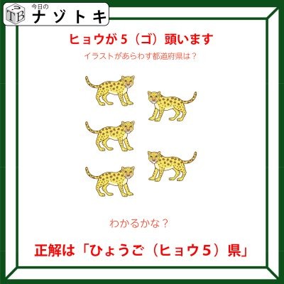 ここまでいえば分かりますね。ヒョウがゴ頭で「ひょうご(兵庫)県」です!正解は兵庫県でした。