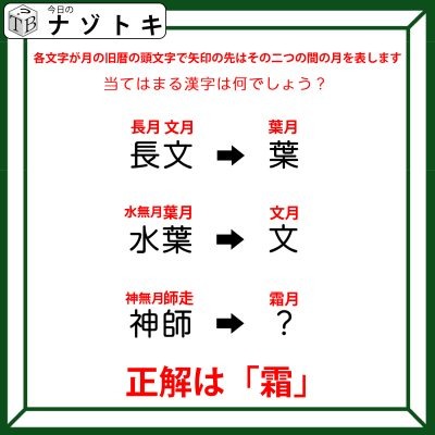 「神師」なのでそれぞれ「神無月」と「師走」です。「神無月」は10月で「師走」は12月なので、11月の頭文字が答えということになりますね。11月は「霜月」なので、正解は「霜」でした。