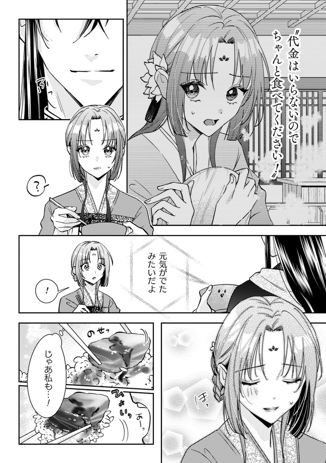 しかし火事が起きて店は消失。食堂の常連で後宮に仕える美しい青年、陽伊鞘に救われるが、彼の頼みで後宮付きの薬膳医になることに。