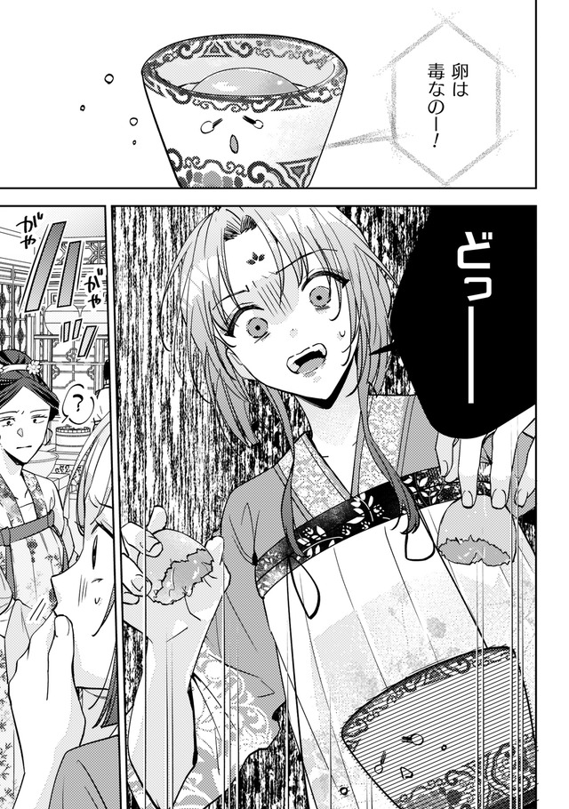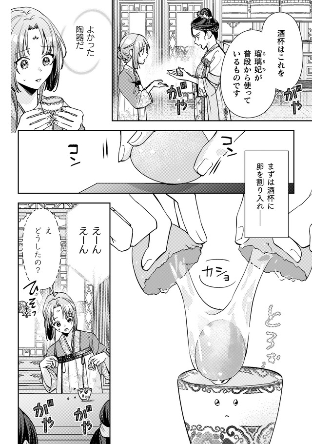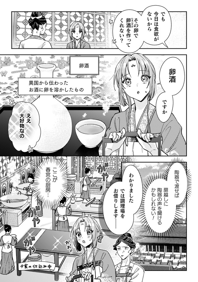 しかし火事が起きて店は消失。食堂の常連で後宮に仕える美しい青年、陽伊鞘に救われるが、彼の頼みで後宮付きの薬膳医になることに。