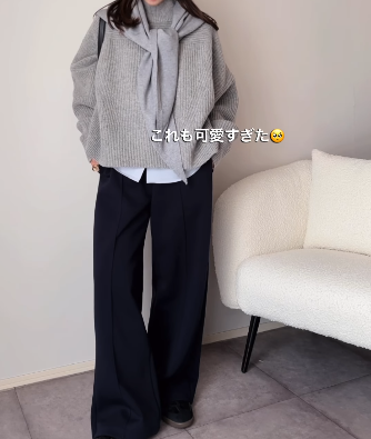 カジュアルアイテムを大人っぽく着こなすコツは、洗練された配色とシルエットにあり。_____ma.k.oさんのスナップでは、ゆったりとしたシルエットの「UNIQLO ラムハイネックセーター」7,990円(157cmでサイズL着用)が、ほどよいボリューム感で着こなしをクラスアップしています。ボトムスに選んだのは、ワイドなシルエットのユニクロシーの「スウェットストレートパンツ」3,990円(Lサイズ着用)。