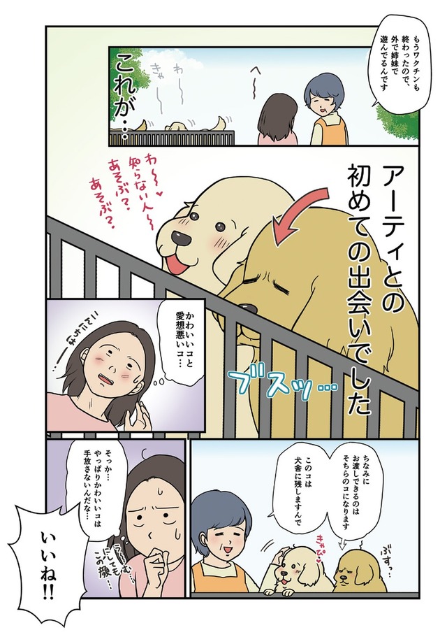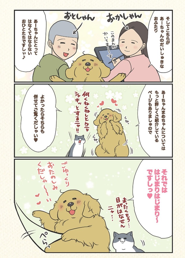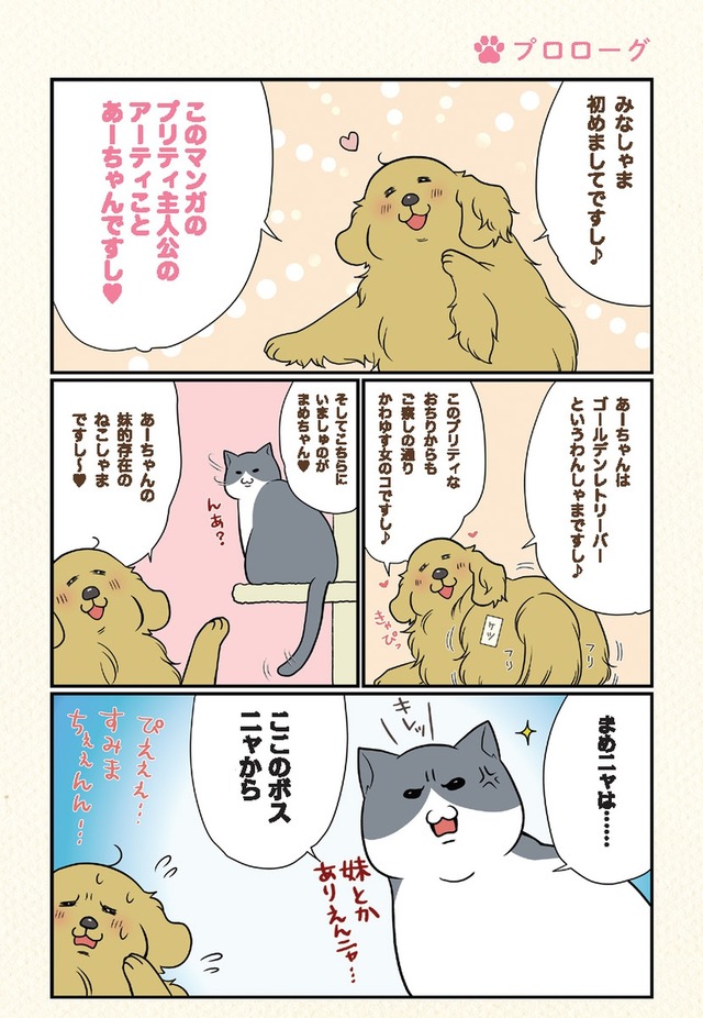 「ですし!」が口癖のゴールデンレトリーバー・アーティと、いつもイライラ怒ってばかりなのに家族思いなハチワレ猫・まめ。