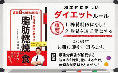 「腹筋しなくても、お腹は引き締まる」。岡田先生がボディビル世界チャンピオンになった経験と日体大教授として研究を重ねてきた「食べて痩せる」法則を編み出しました、それが「除脂肪食(じょしぼうしょく)」です。