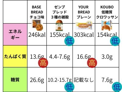 特に注目したい点は、「高」「低」のアイコンをつけた場所。この数値をもとに考えると、パンを「どのように食べたいか」によって、選びたいパンが変わってきそうです。
