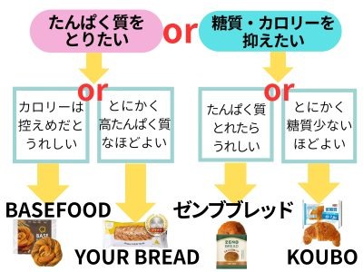 「糖質オフ&高たんぱくパン」を選ぶとき、あなたがより重視するものは? 上記の栄養比較表でわかった、各商品の特徴を整理してチャートにしていました。まずは「たんぱく質をとりたい」のか、それとも「糖質・カロリーを抑えたい」のかを選び、矢印に沿って進んでみてください!