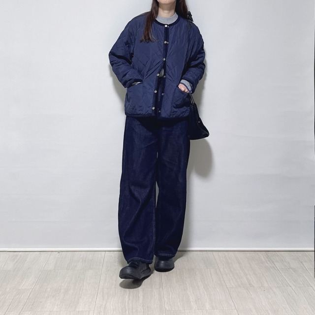 全身をネイビーのトーンで統一した、都会的で清潔感あふれる着こなしは大人世代にこそおすすめ。chiharu1978さんは、ダイヤキルトのノーカラージャケットを主役に、リラックス感と品の良さを両立させています。このジャケットは、程よいボリューム感がありながらもノーカラーですっきり見えるため、重たくなりがちな冬の装いを軽やかに仕上げてくれます。