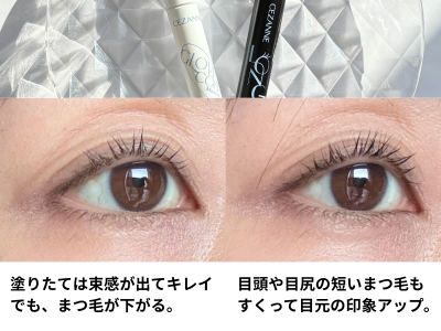 筆者がお試ししたところ、「セザンヌ グロウコートマスカラ 00 クリアグロウ」は、ツヤ感でまつ毛が美しく見えるものの、束感になって重みが出るせいか、カールがダウンしやすいと感じました。まつ毛のハリ・コシの低下が気になる40・50代の中には、同様の感想を持つ方がいるかもしれません。