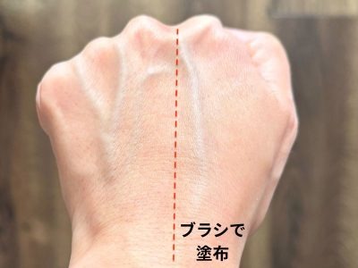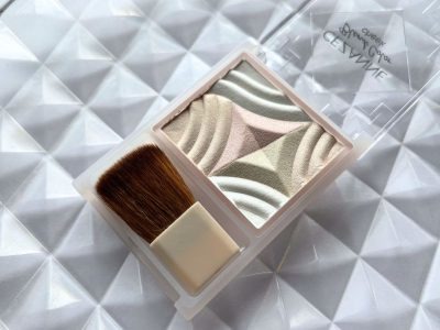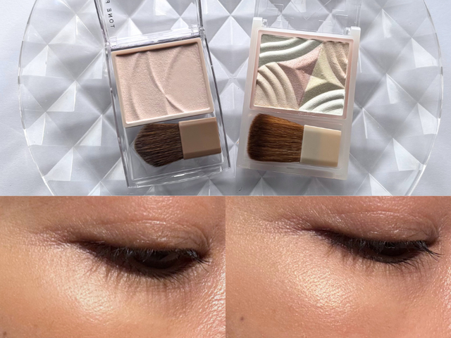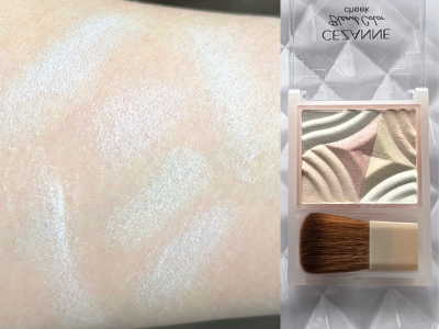 一方、「セザンヌ ブレンドカラーチーク H1 ペールハイライト」は、繊細なパールによる煌めきでツヤ感や立体感を与える王道のハイライト。確かに繊細な輝きなのですが、ホワイト、イエロー、ピンク、ベージュと色とりどりのパールが肌のうえで目立つ印象があります。そのため、肌から若干浮く印象があり、40・50代の肌に塗ると、毛穴やシワを悪目立ちさせる可能性があります。