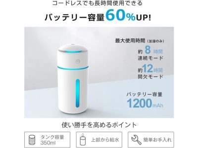 【2025改良モデル】 加湿器 卓上 小型 Type-C充電式 卓上加湿器 除菌 大容量350ML 超音波式 次亜塩素酸水対応 静音 持ち運び便利 軽量 コンパクト コードレス 2段階ミスト 7色LEDライト 乾燥対策 花粉対策 水漏れ防止 長時間運転 自動停止機能 オフィス 子供部屋 寝室 車載 家庭用 (ホワイト)