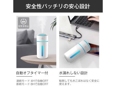 Amazonの加湿器で一番人気。とにかく小さい! バッグに入れて携帯したり、車載用にしても。7色のLEDライトつき