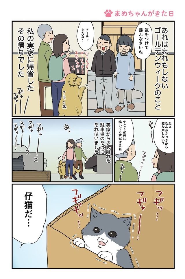 「ですし!」が口癖のゴールデンレトリーバー・アーティと、いつもイライラ怒ってばかりなのに家族思いなハチワレ猫・まめ。
