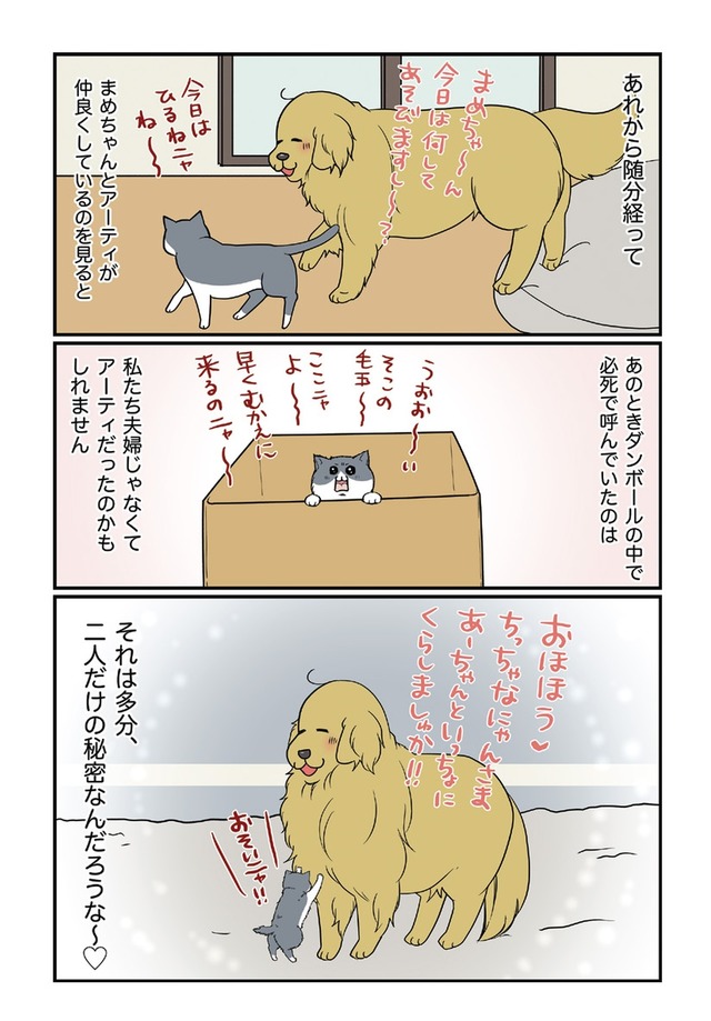 「ですし!」が口癖のゴールデンレトリーバー・アーティと、いつもイライラ怒ってばかりなのに家族思いなハチワレ猫・まめ。