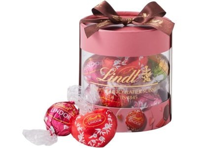 リンツ】円筒ケースにリボンが結ばれた、帽子箱みたいなギフトボックス。期間限定の「バレンタイン」フレーバーやハート型チョコも入ってます!