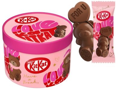 【キットカット】パーティボックスの中には、キュートなクマ型キットカットが35個♪ 箱のふたをよく見るとハート型に書かれた「Have a kitkat」の中に、「LOVE」の文字が!