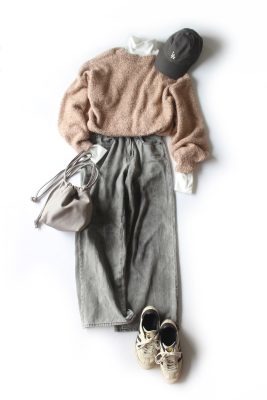 ベージュ×グレーのように印象がぼんやりしがちな組み合わせでも、首元と袖口からちらっと白を見せて着ると洒落て見えます。
